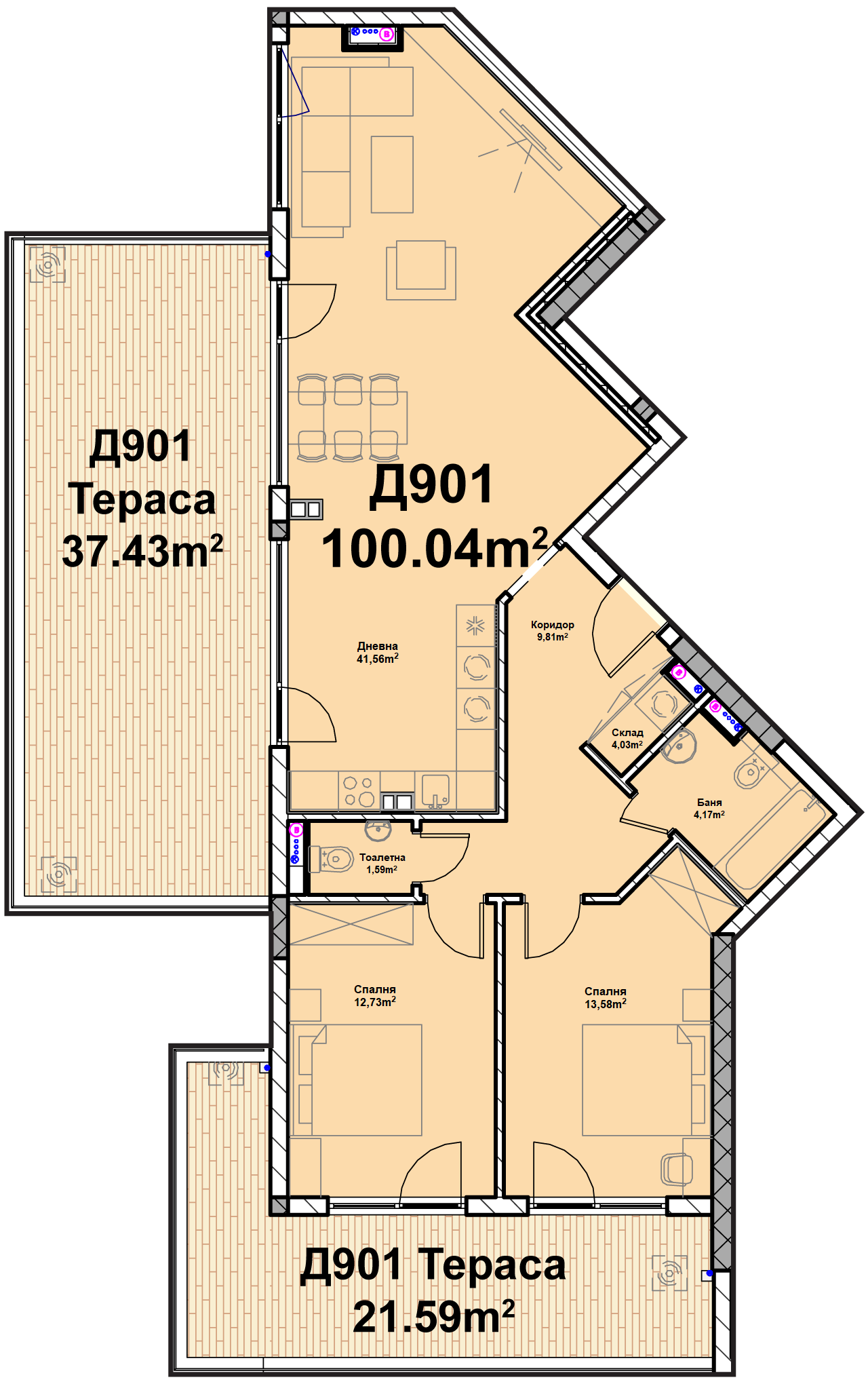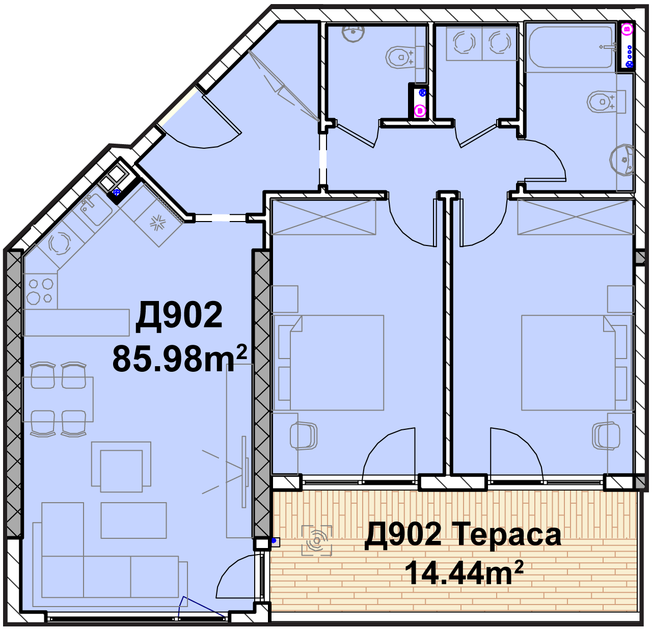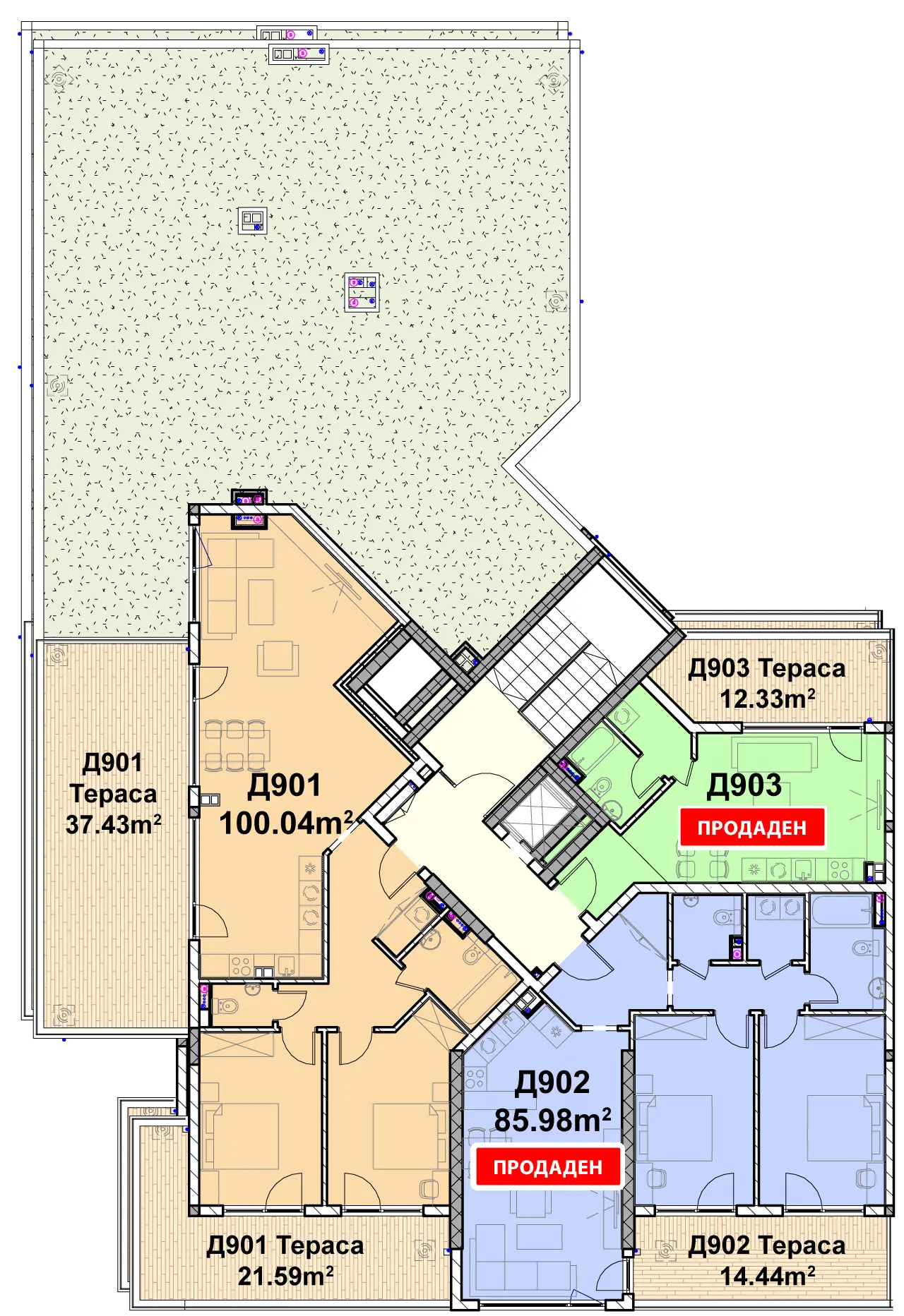 Етаж 10 от вход Д се състои от 3 двустайни и тристайни апартамента и тераси