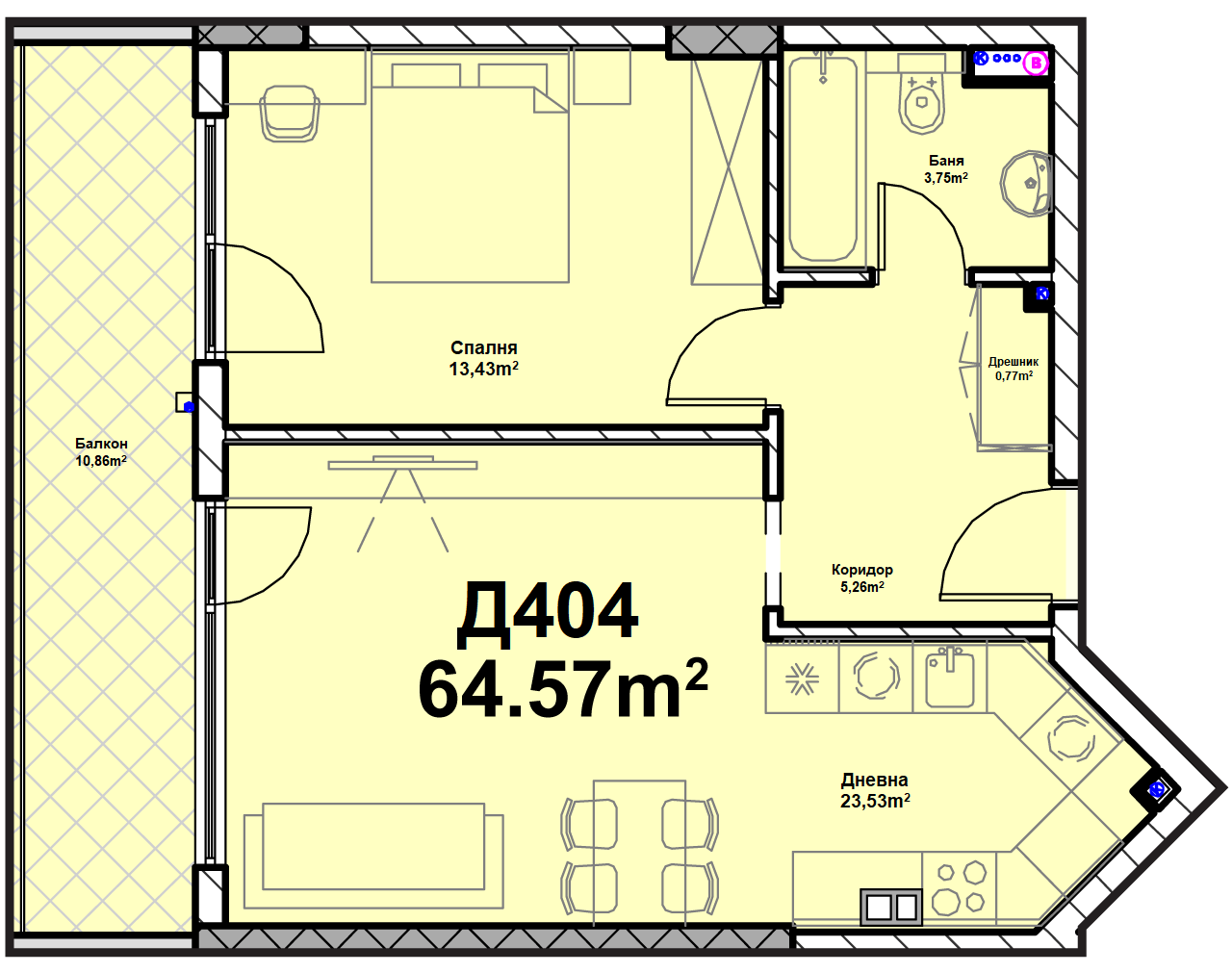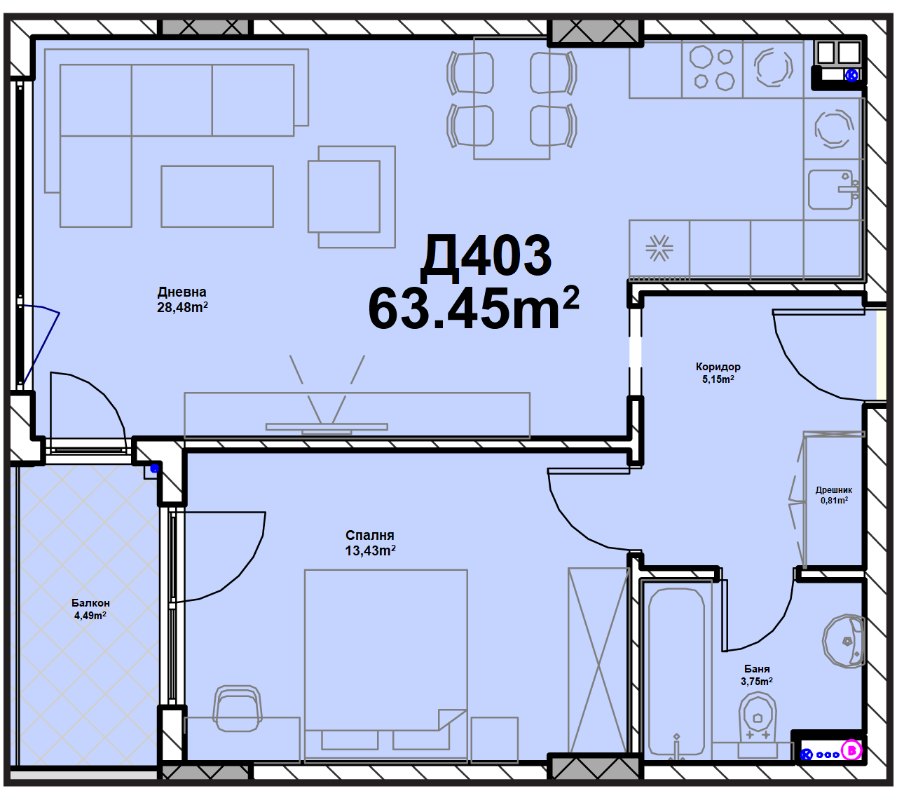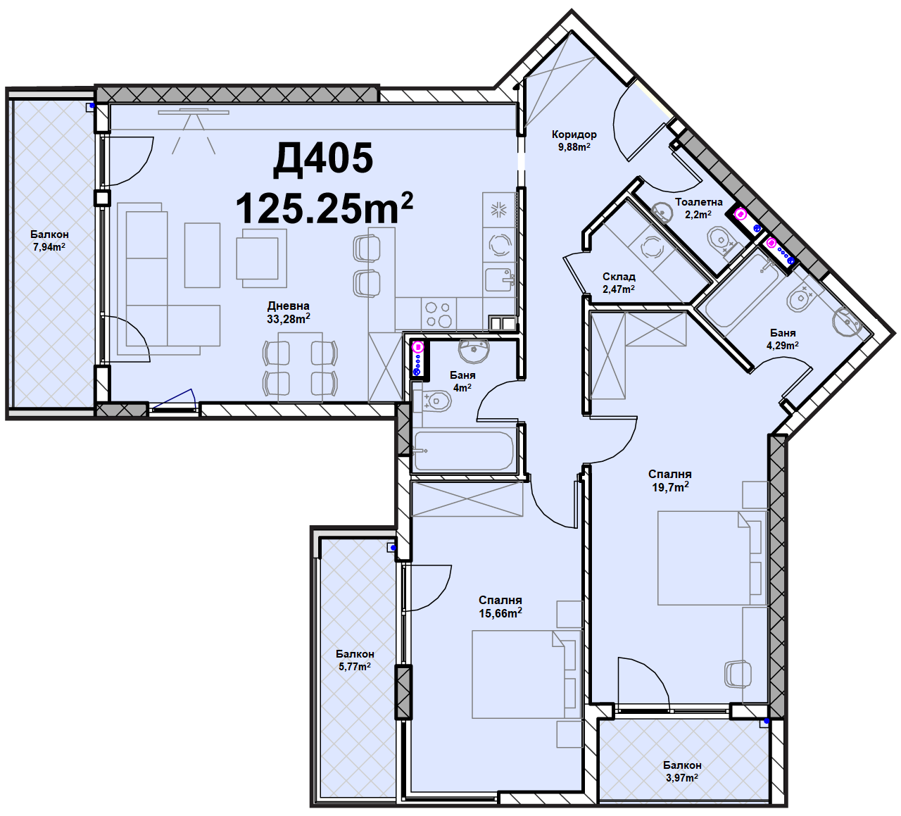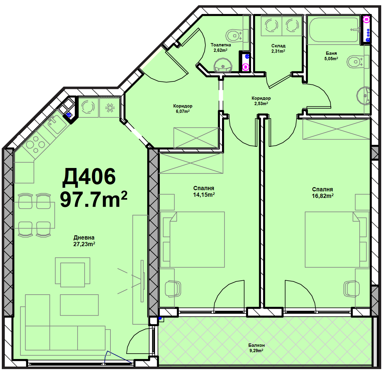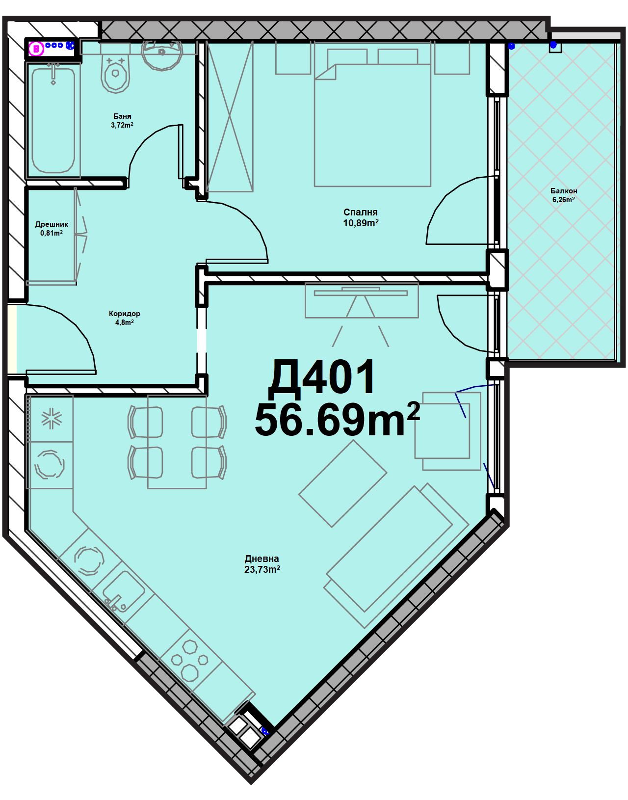 Етаж 5 от вход Д се състои от 7 двустайни и тристайни апартамента