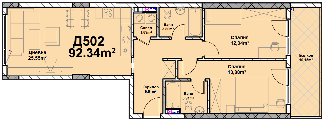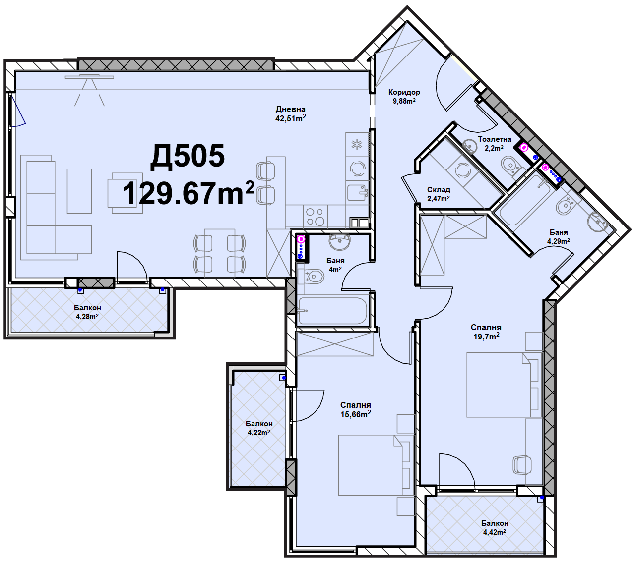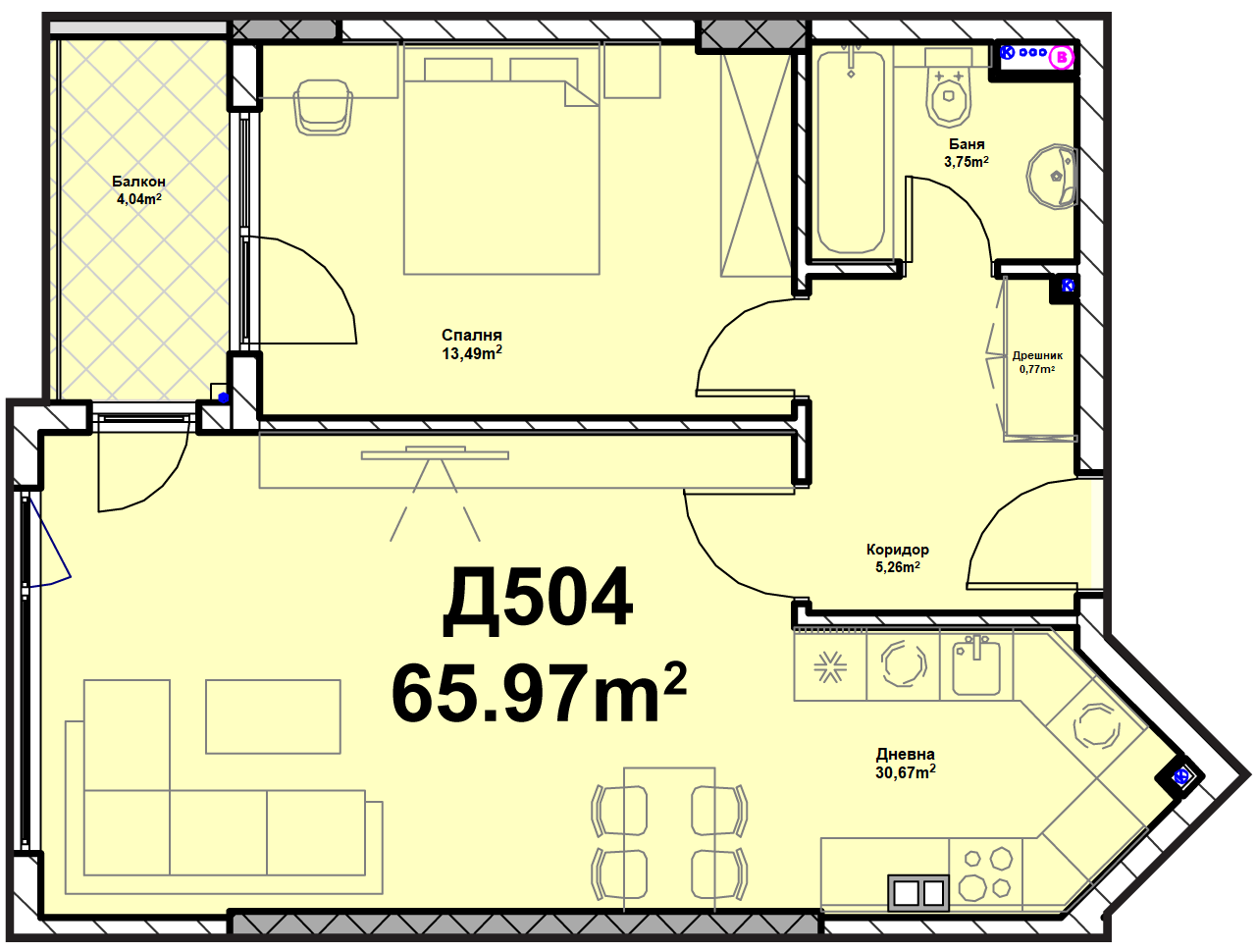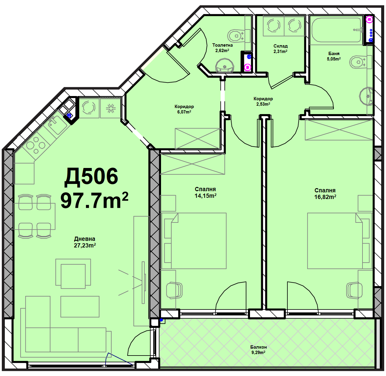 Етаж 6 от вход Д се състои от 7 двустайни и тристайни апартамента
