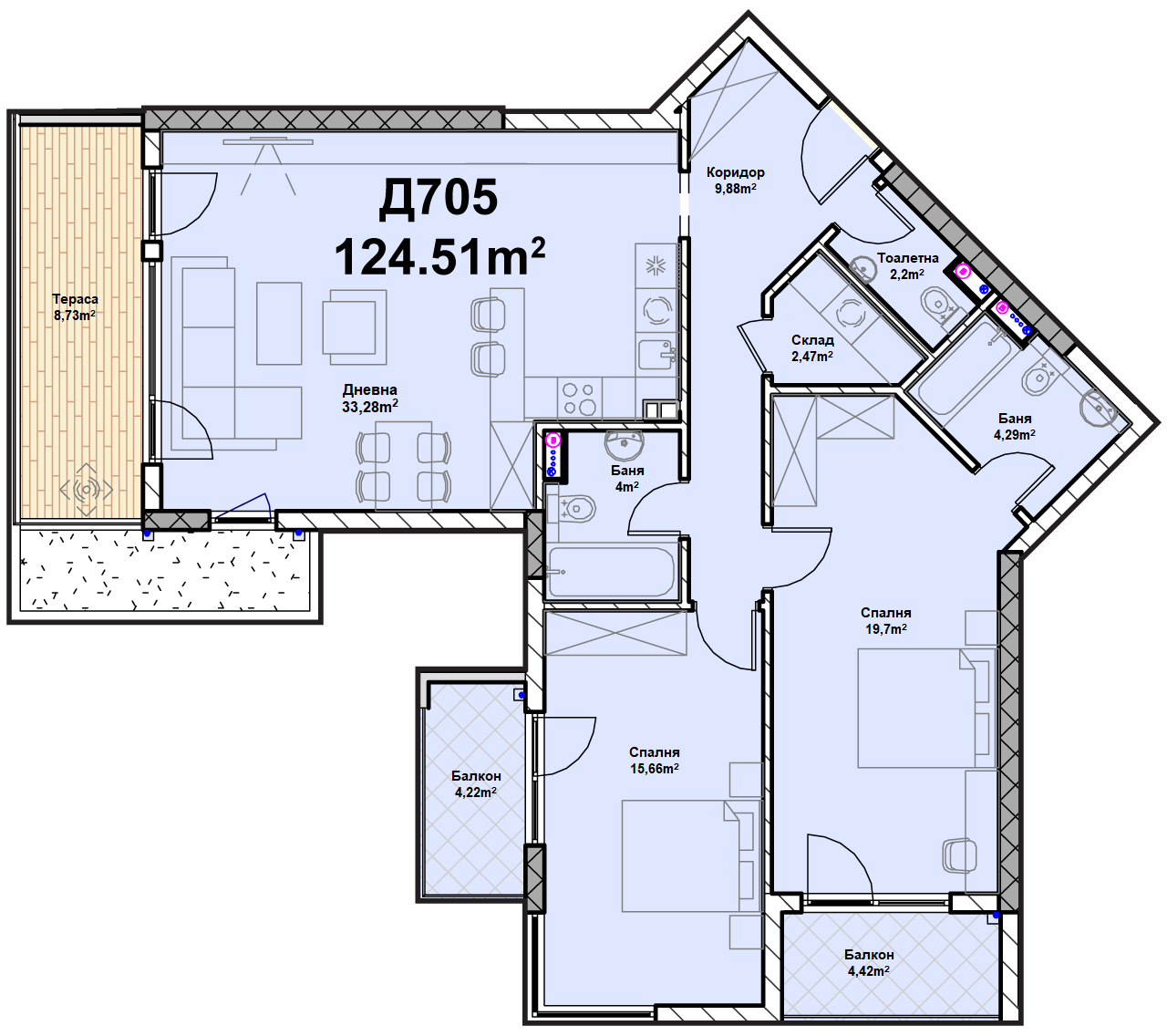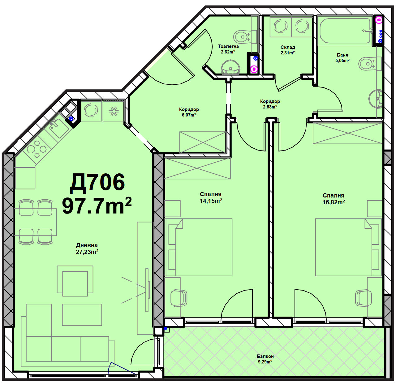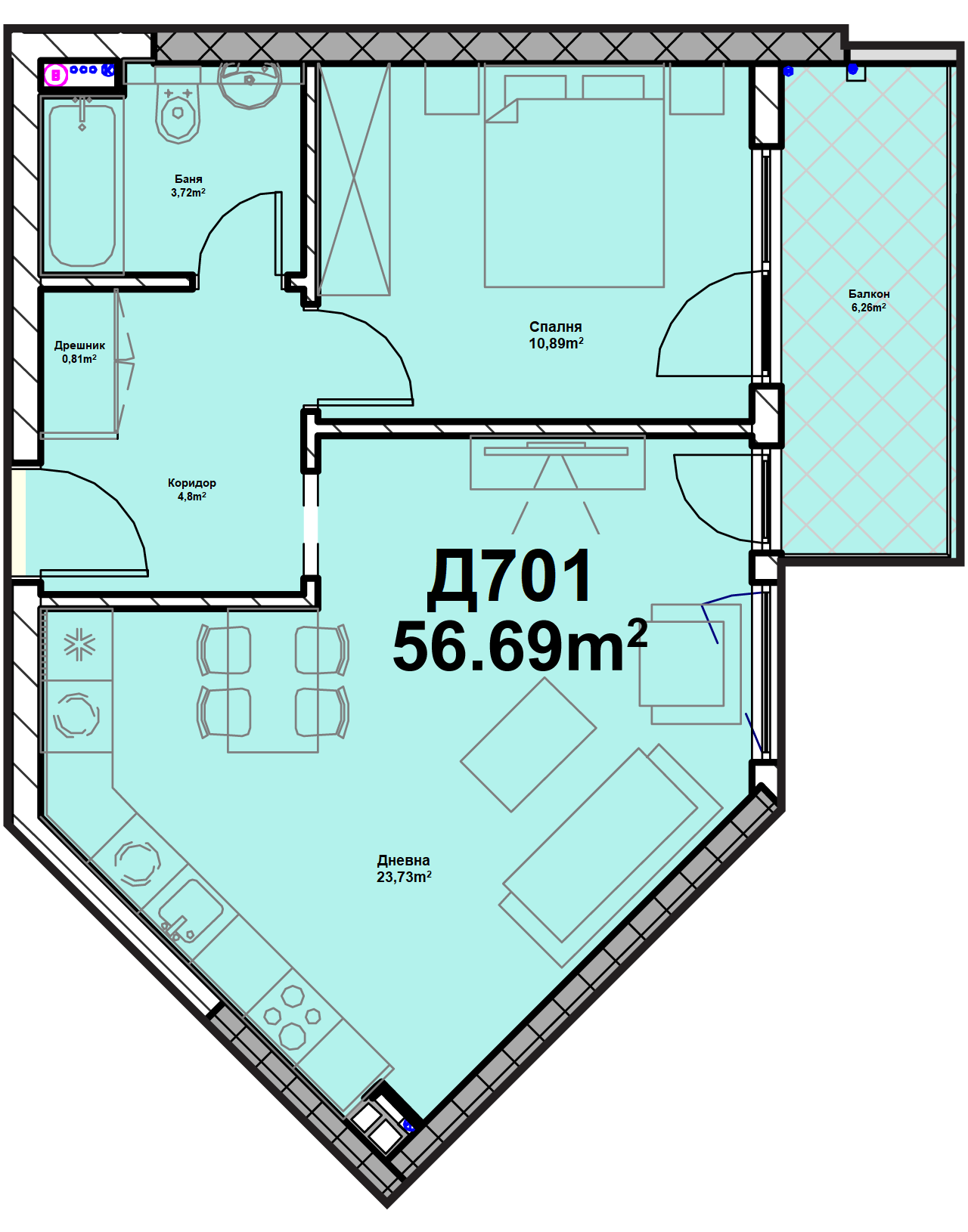 Етаж 8 от вход Д се състои от 7 двустайни и тристайни апартамента