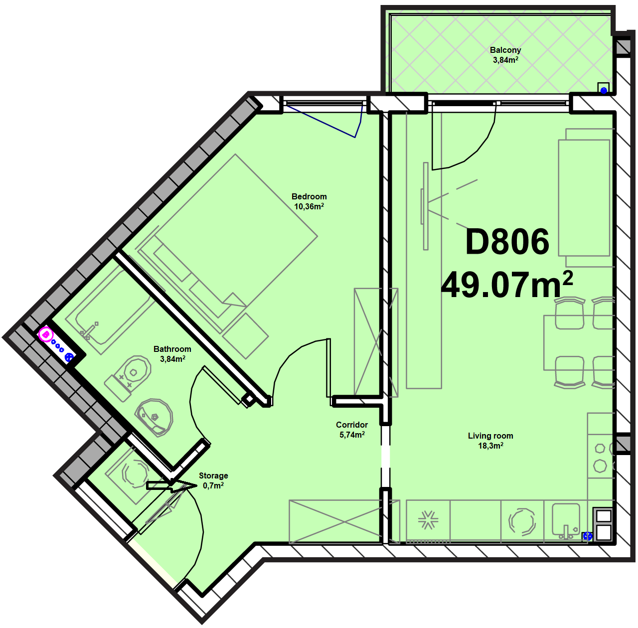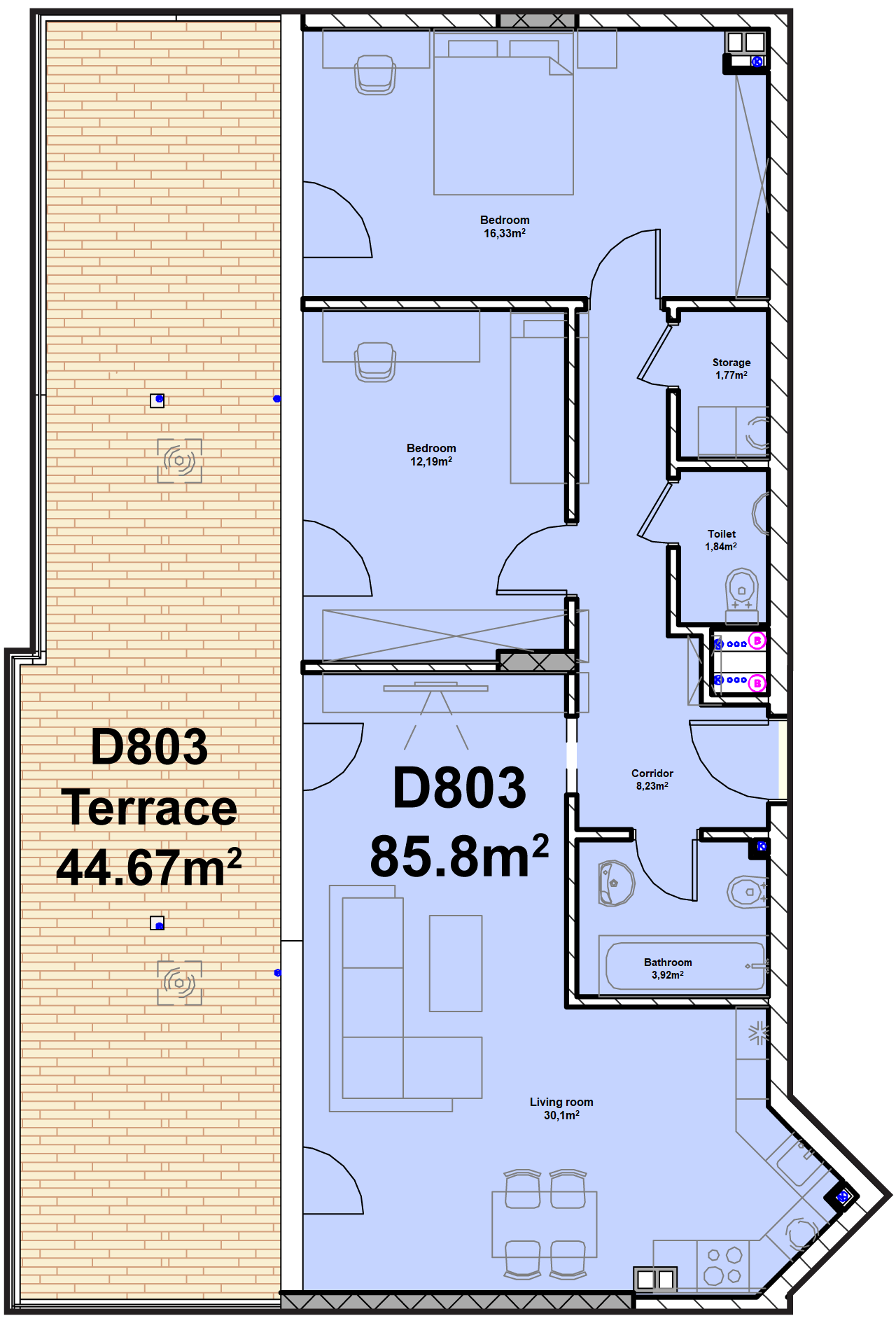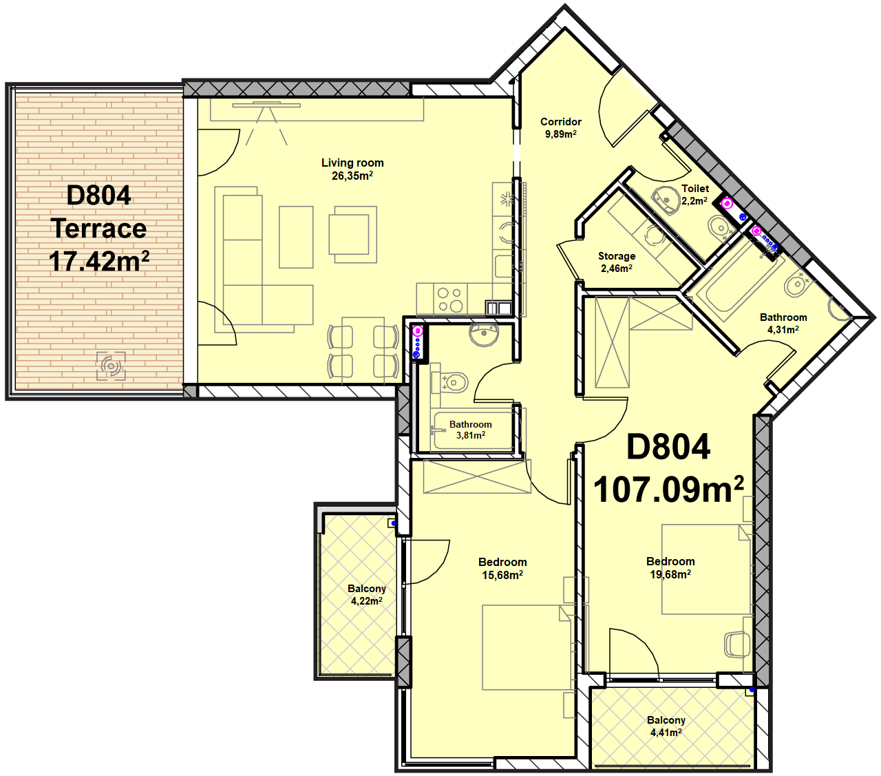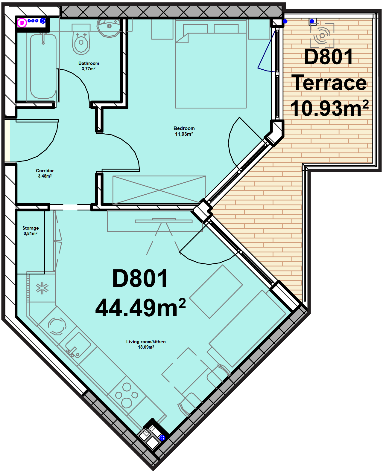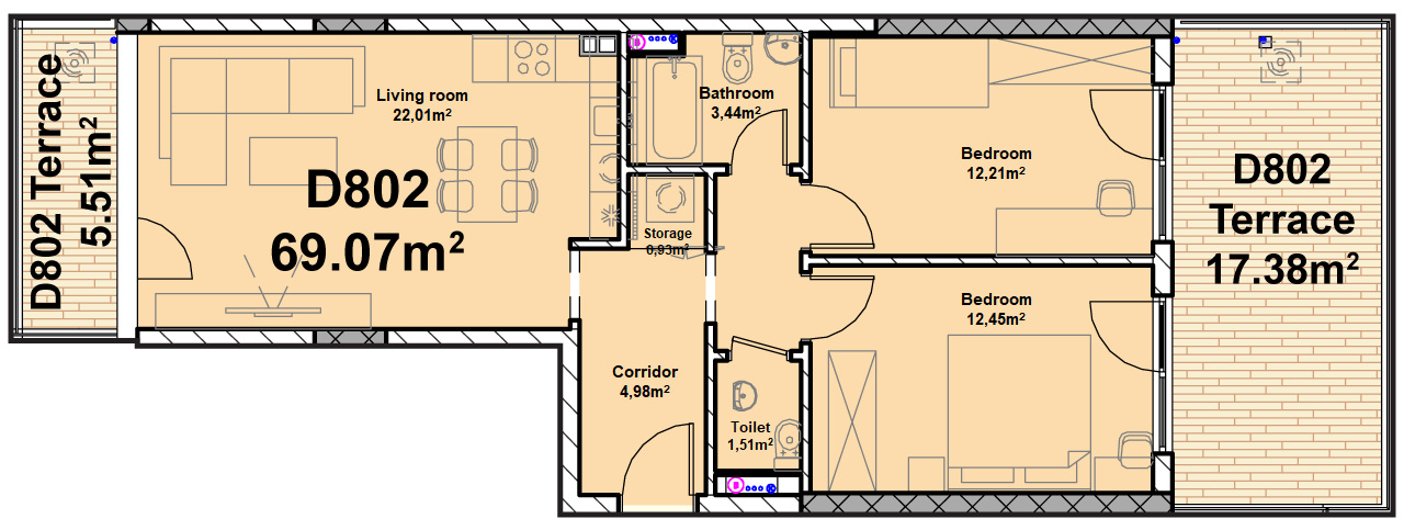 Floor 9 of Building D consists of 6 apartments with 1 or 2 bedrooms and terraces.