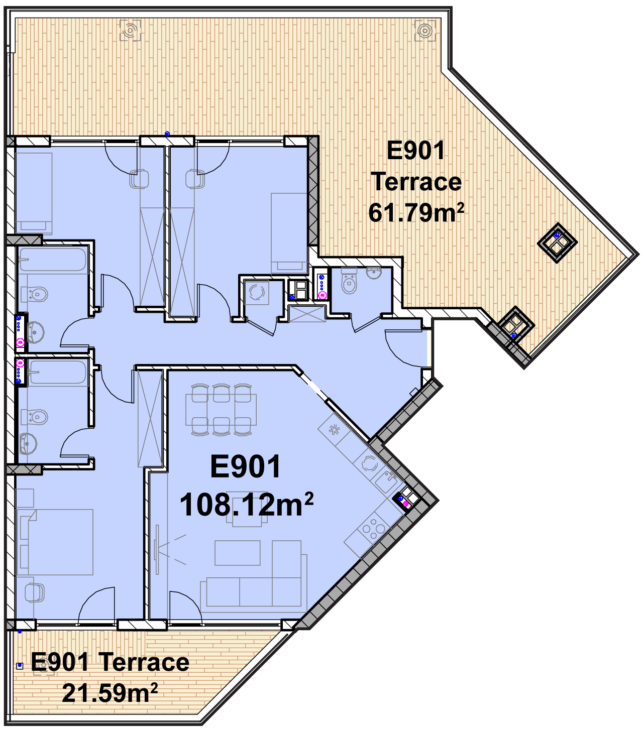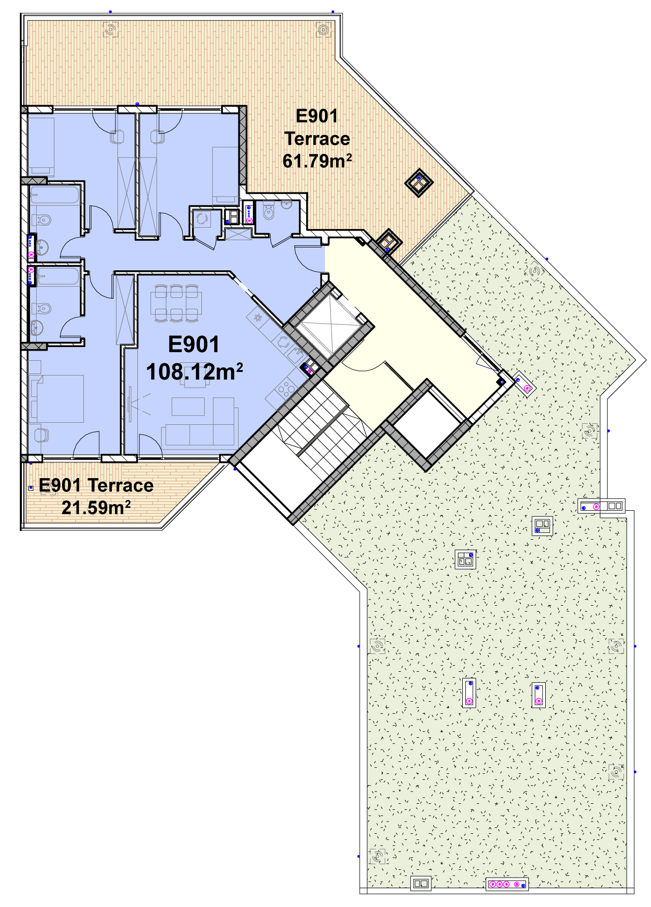 Floor 10 of Building E consists of 1 apartment with 3 bedrooms and 2 large terraces.