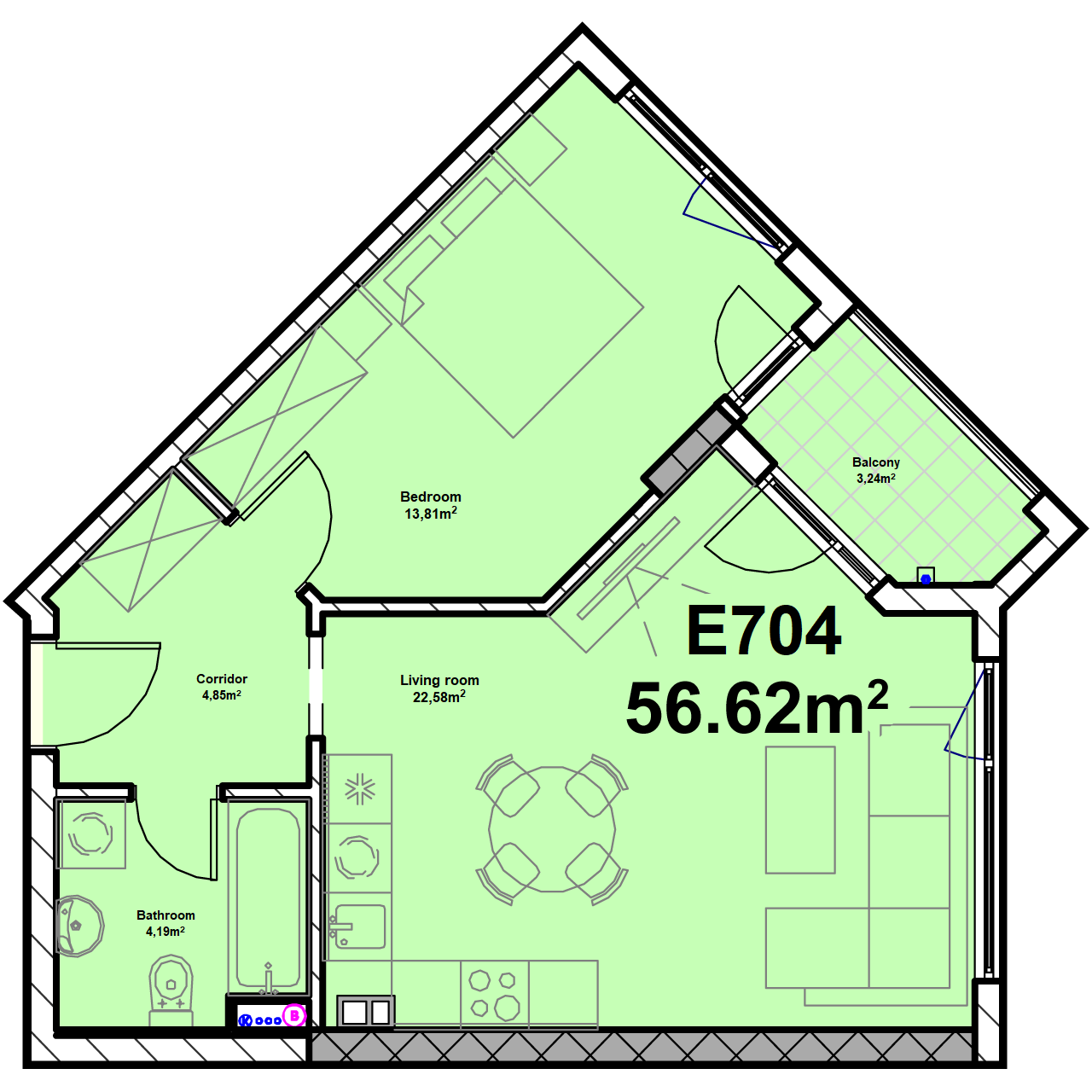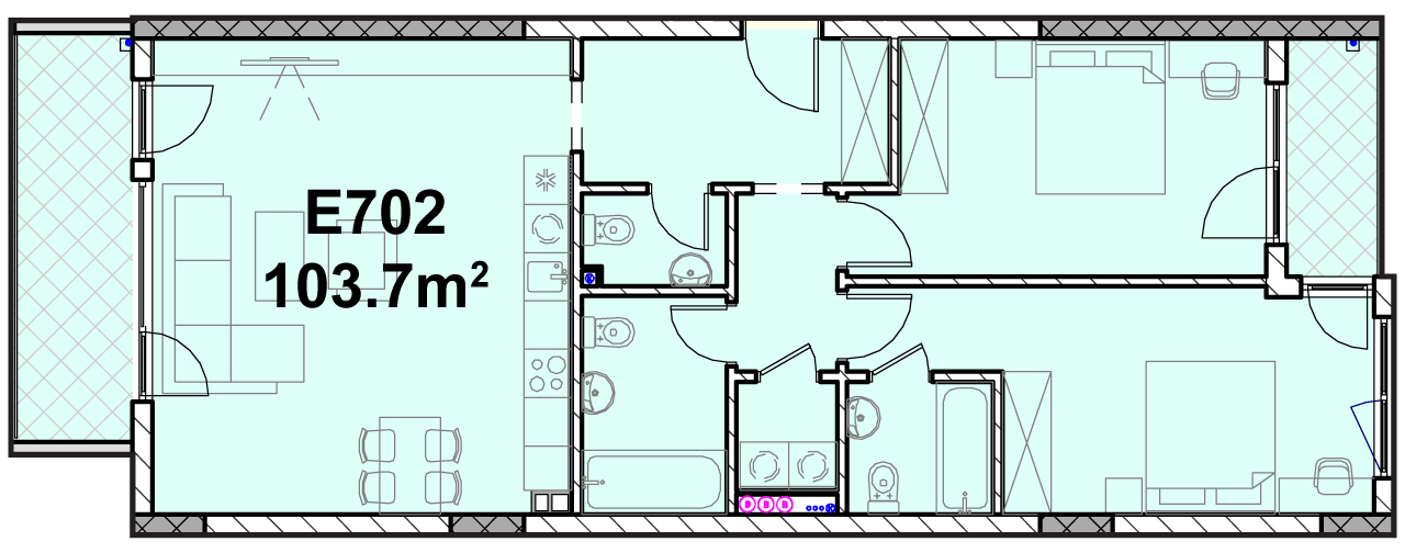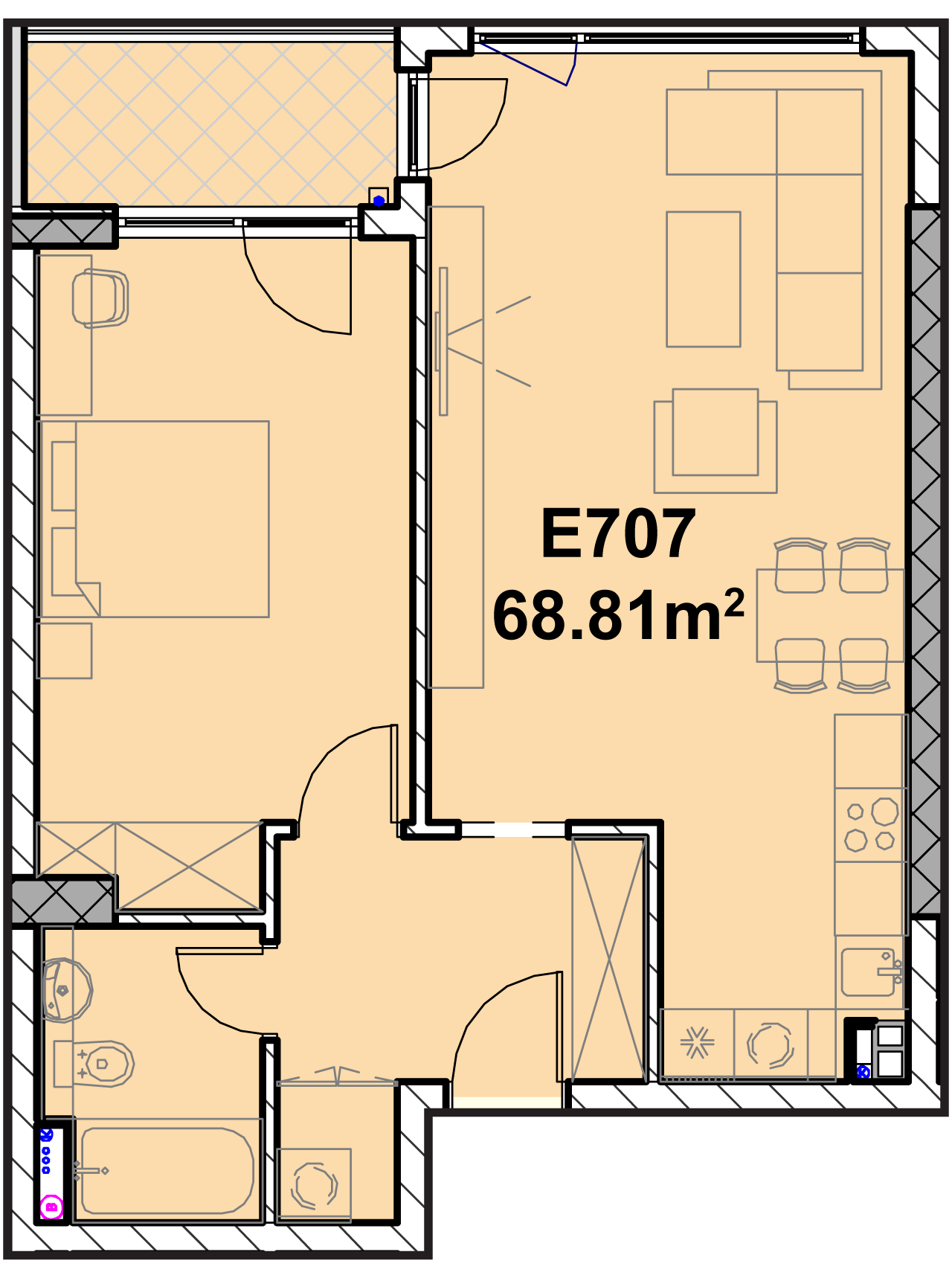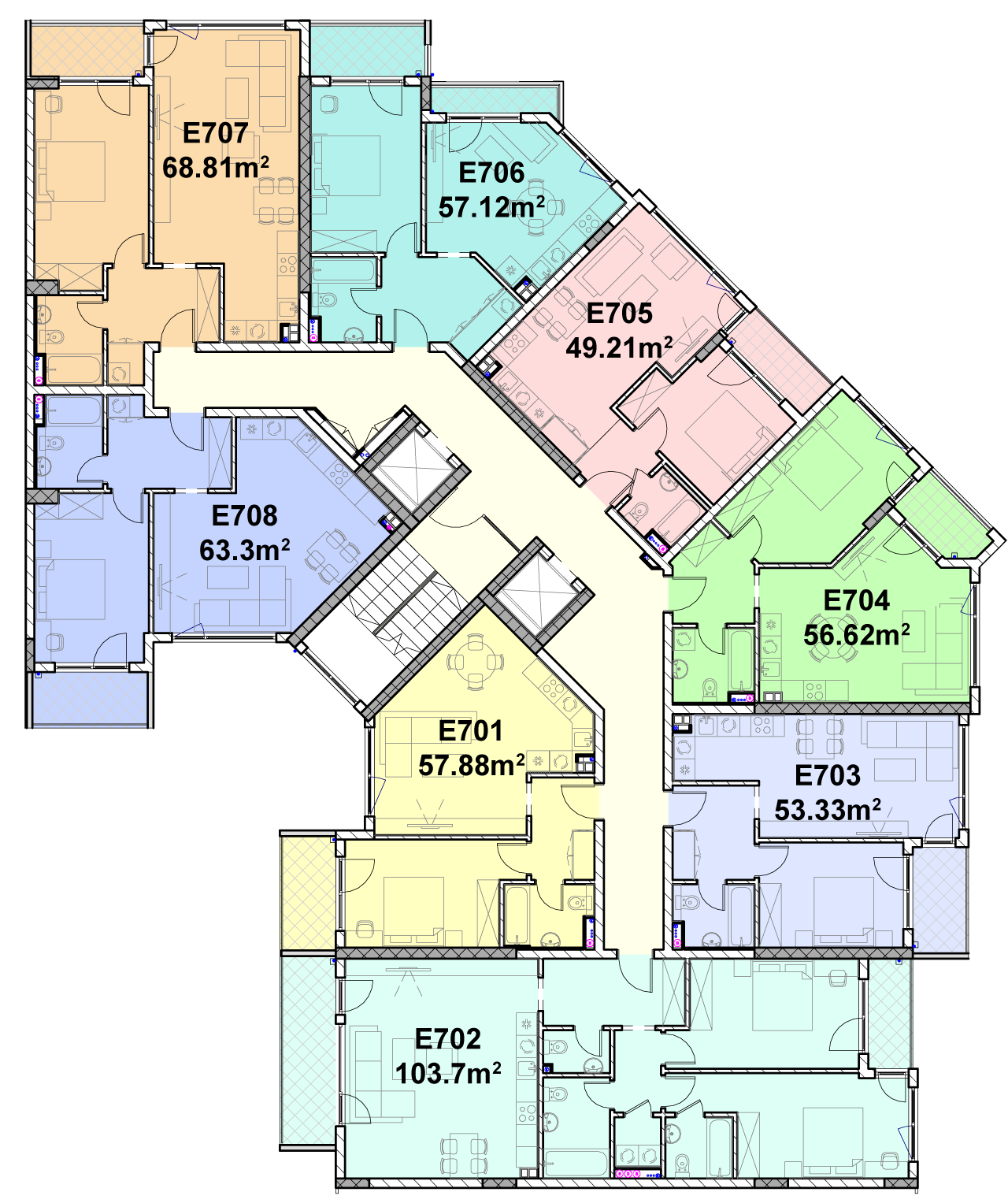 Floor 8 of Building E consists of 8 apartments with 1 or 2 bedrooms and terraces.