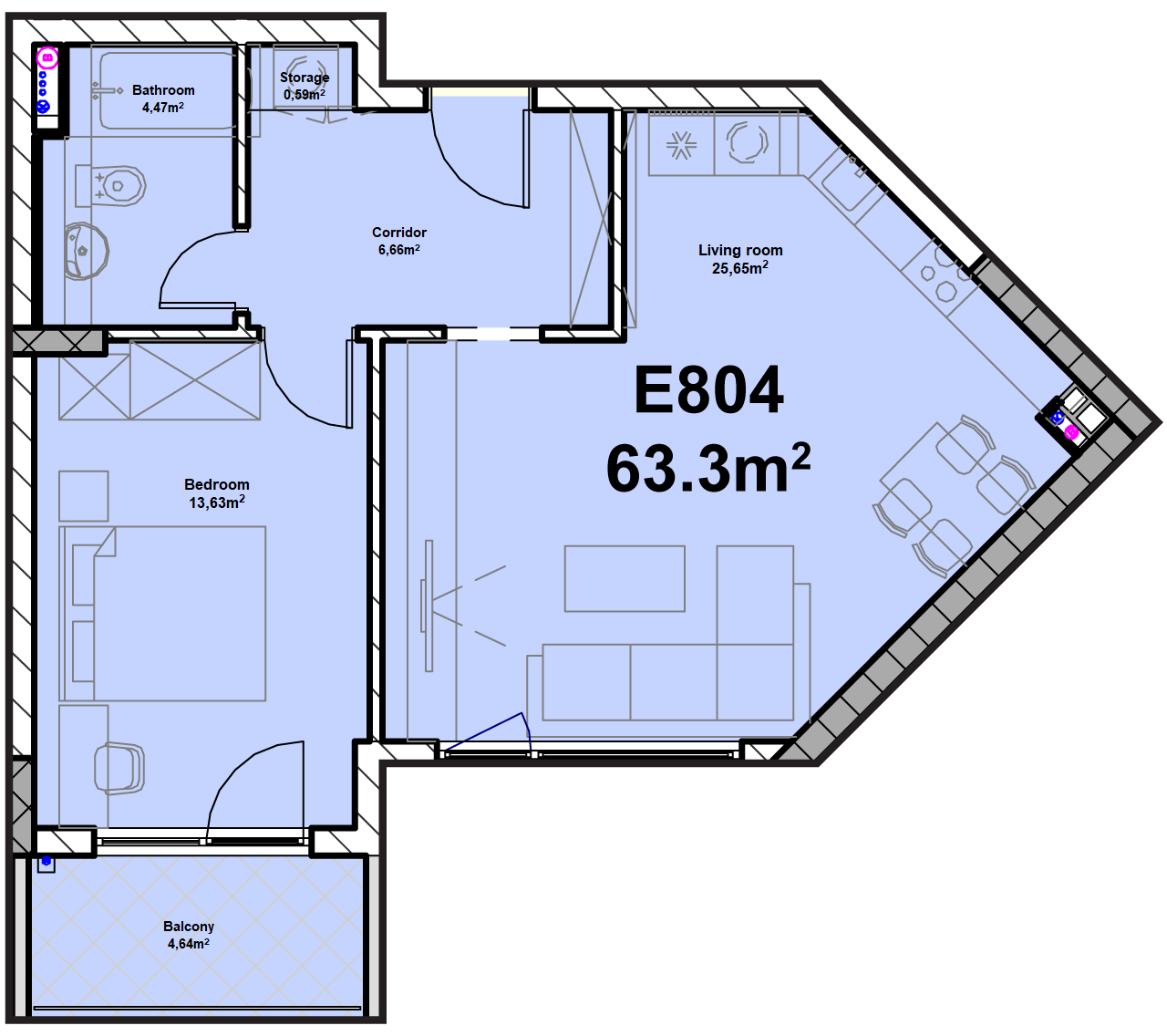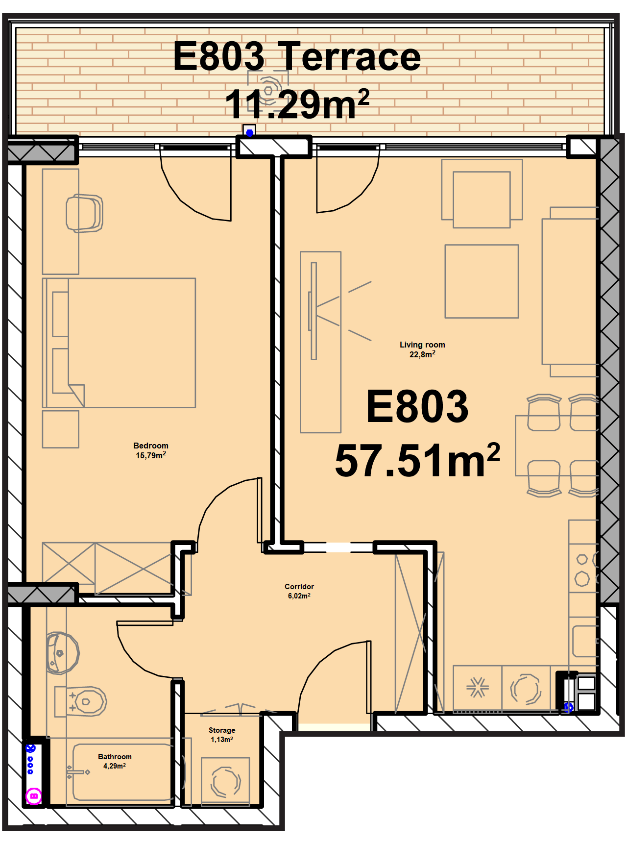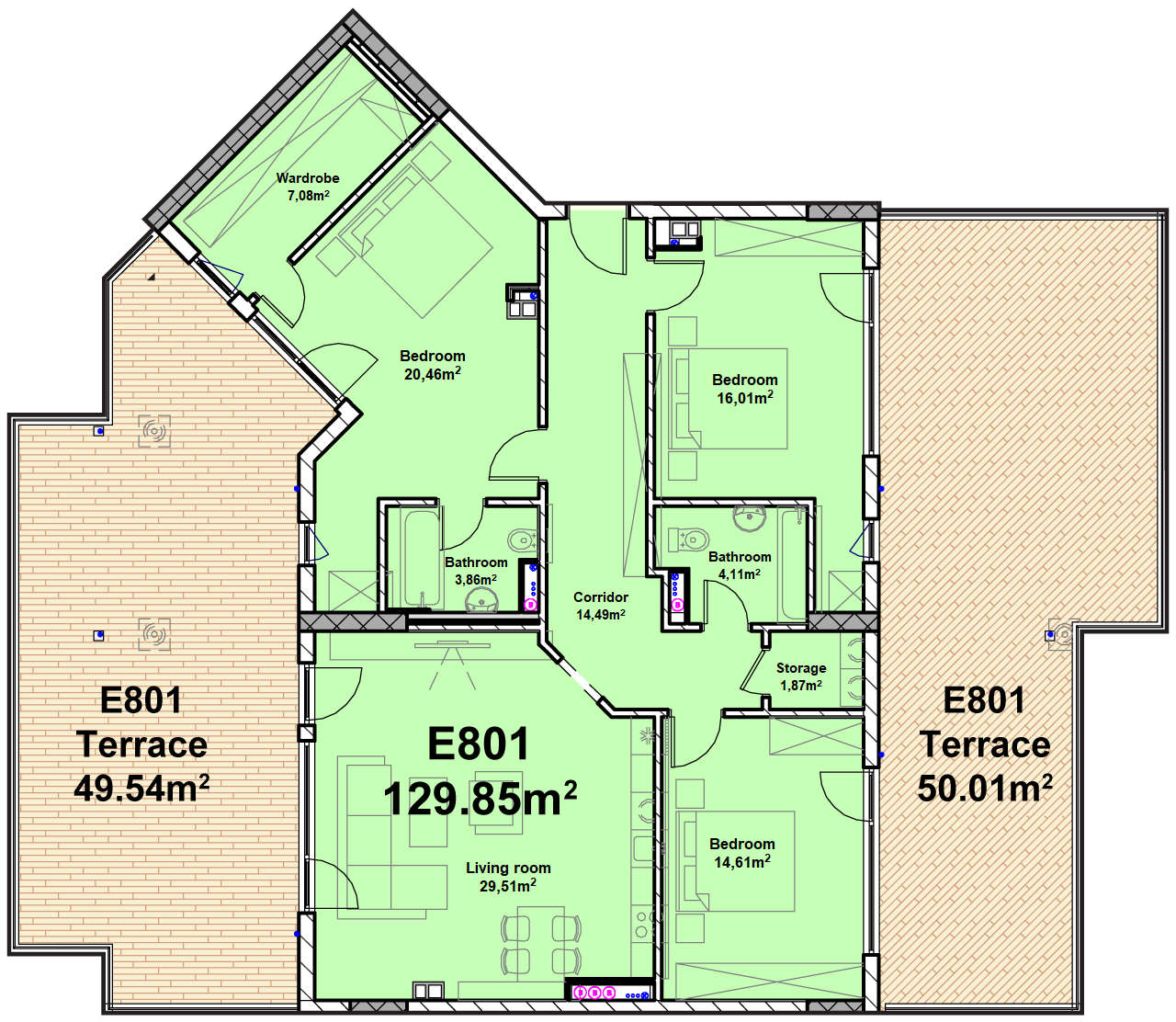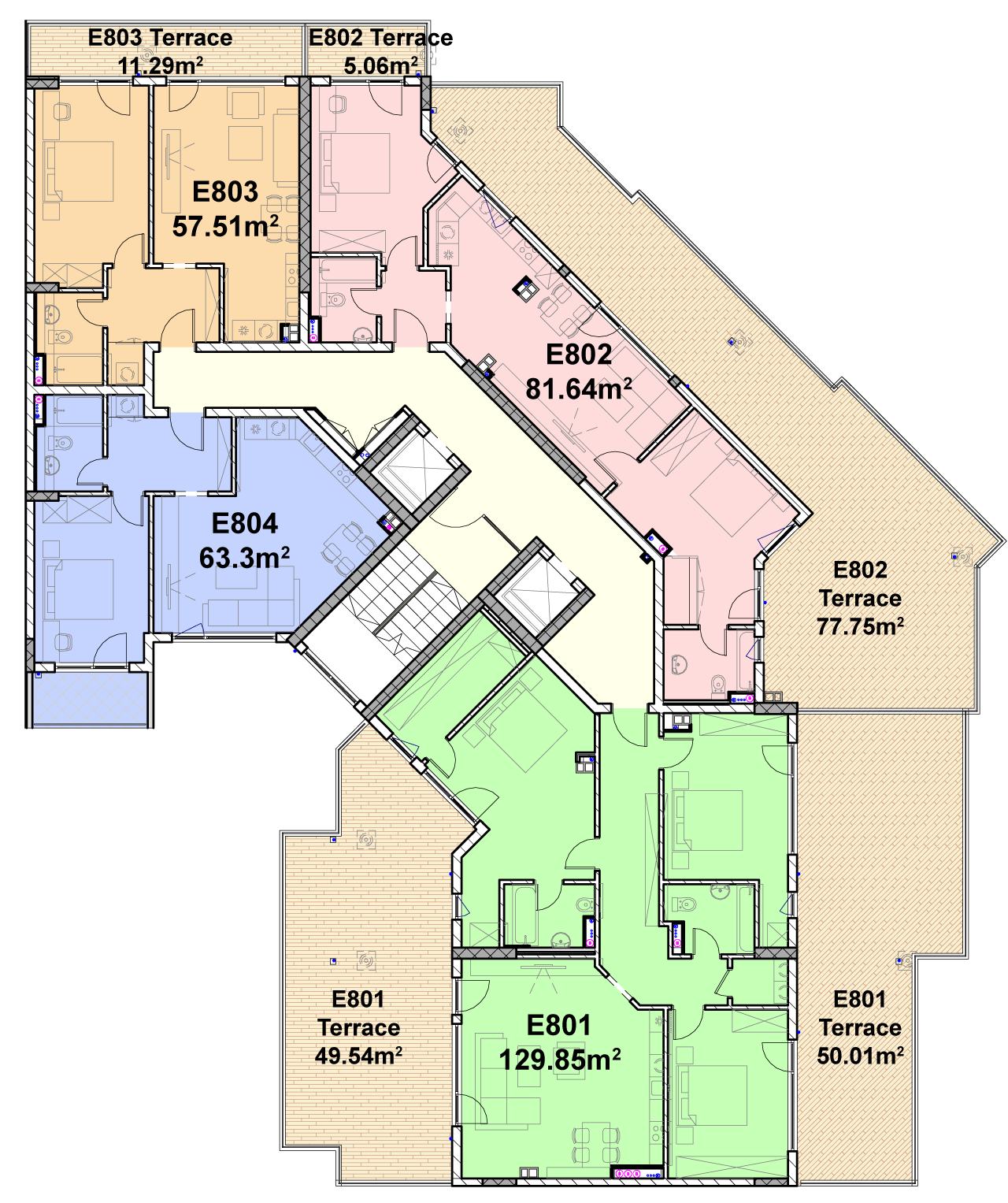 Floor 9 of Building E consists of 4 apartments with 1, 2 or 3 bedrooms and terraces.