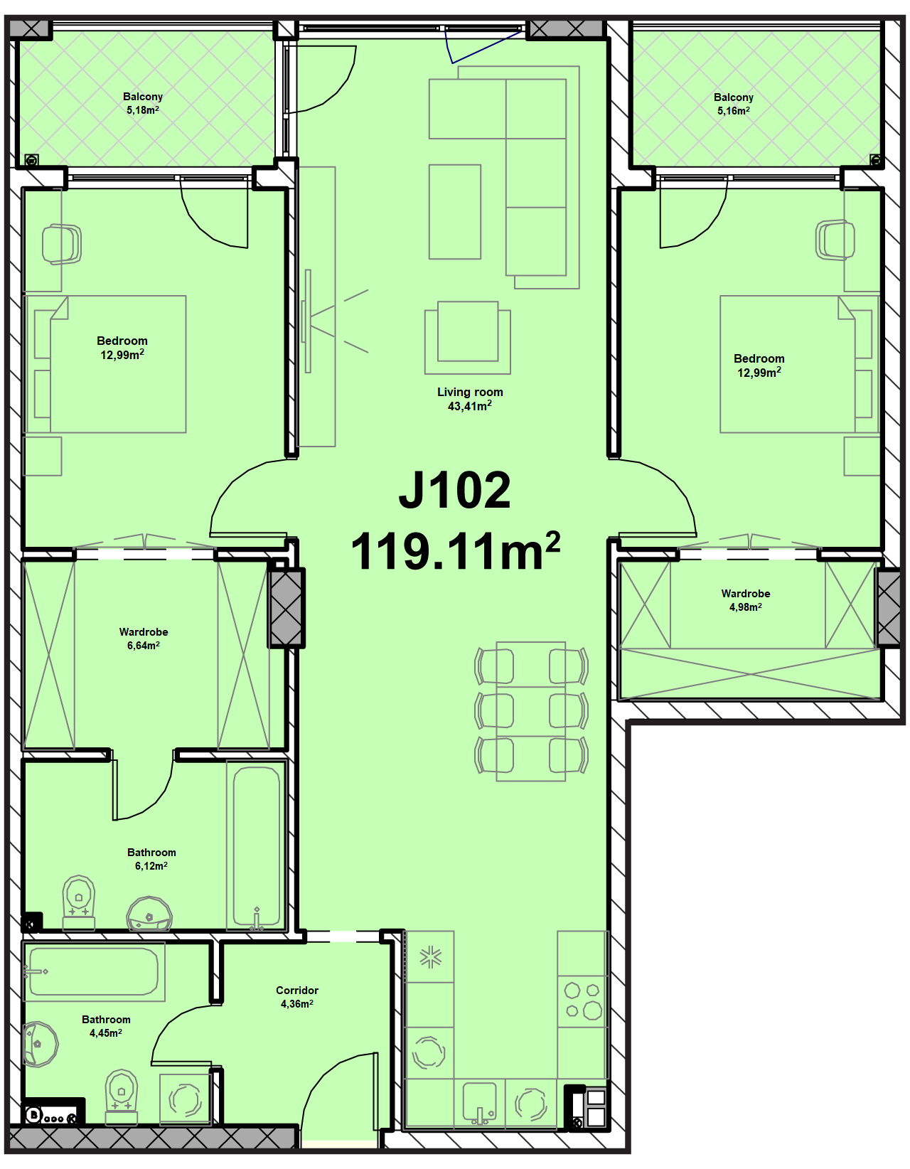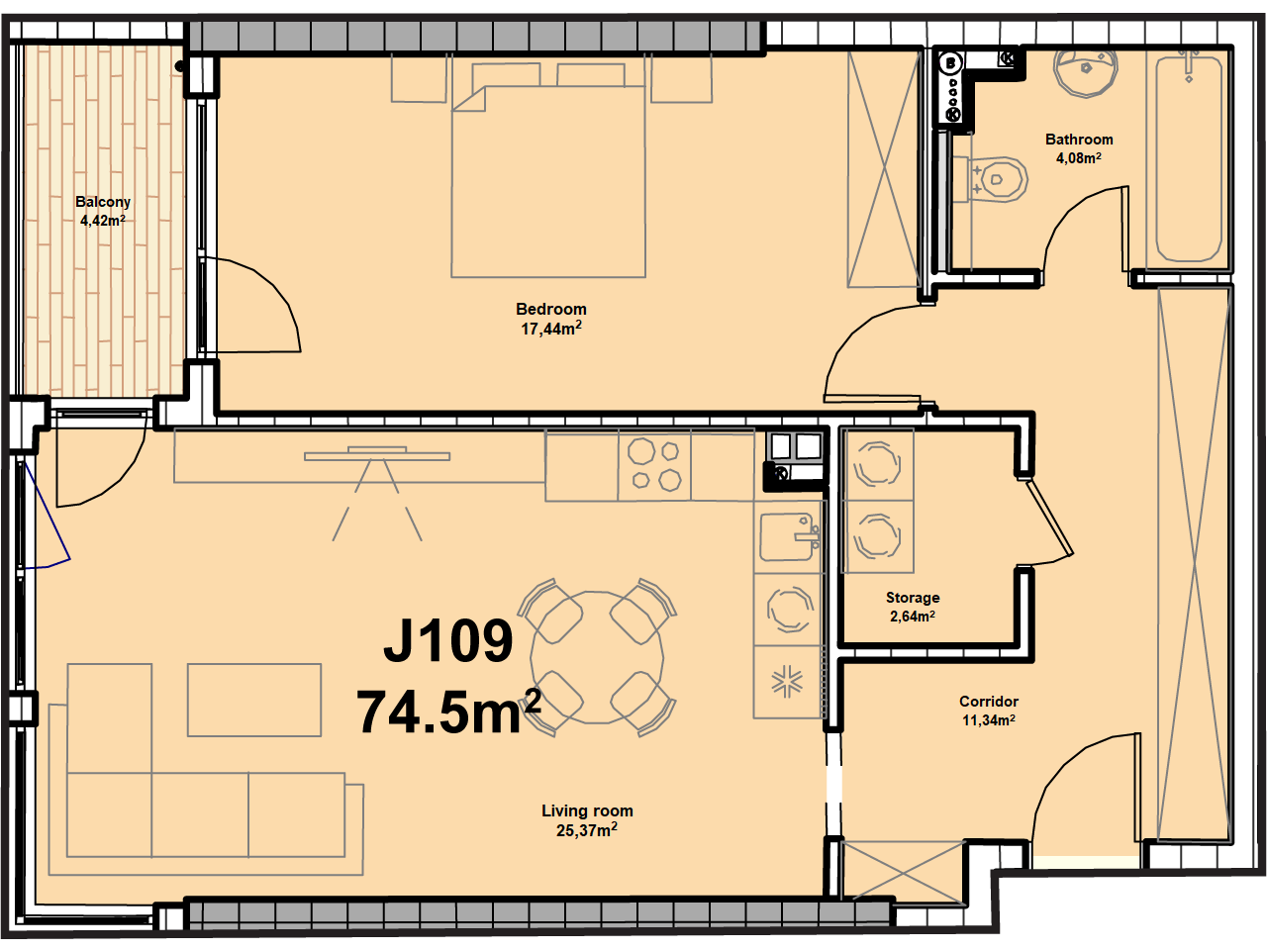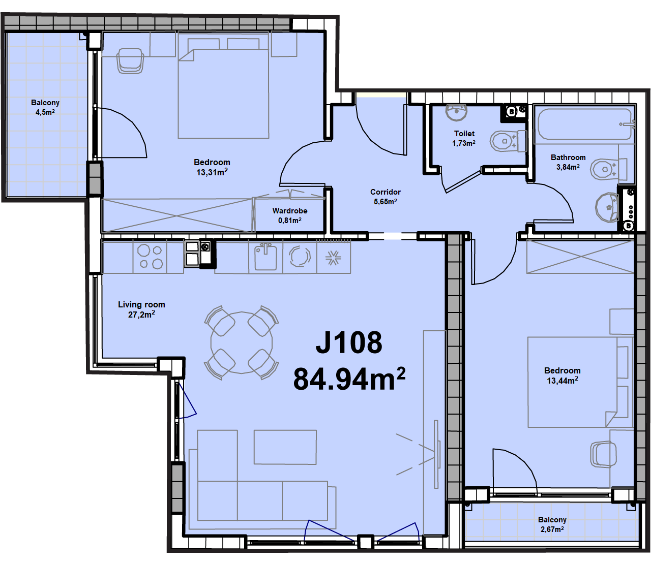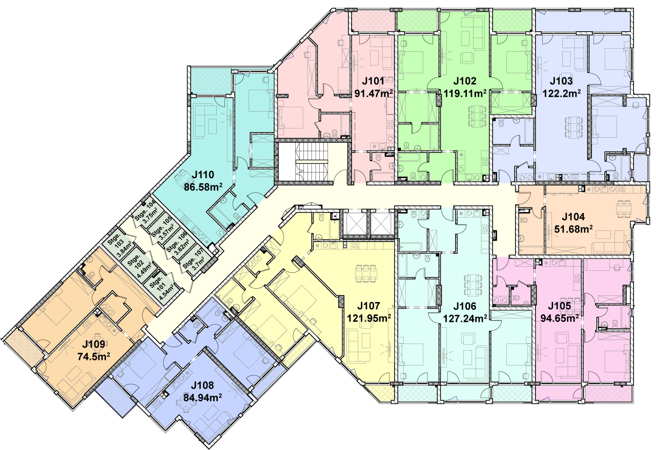 Floor 2 of Building J consists of 10 apartments with 1 or 2 bedrooms and terraces.