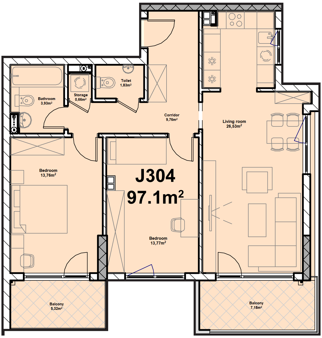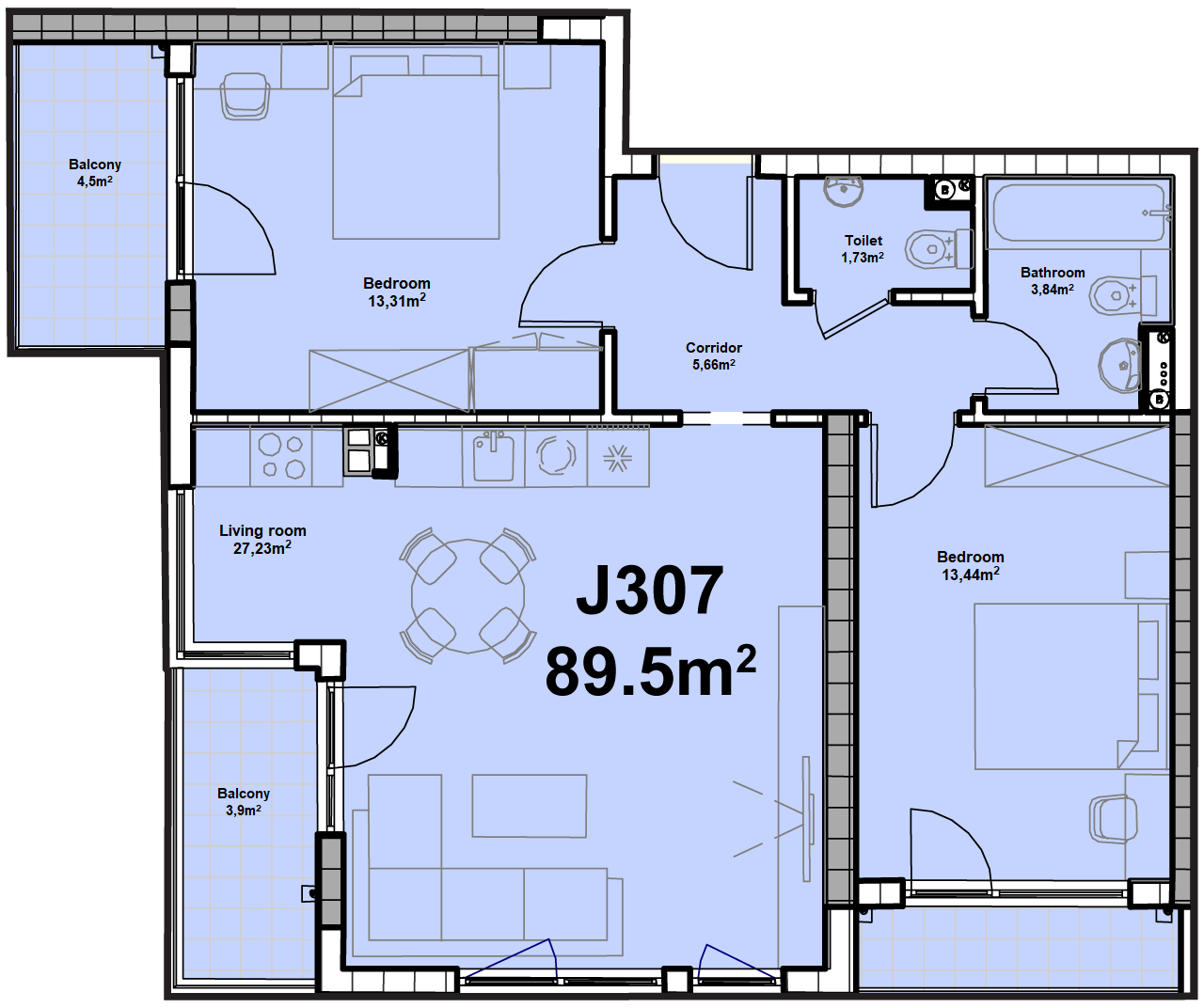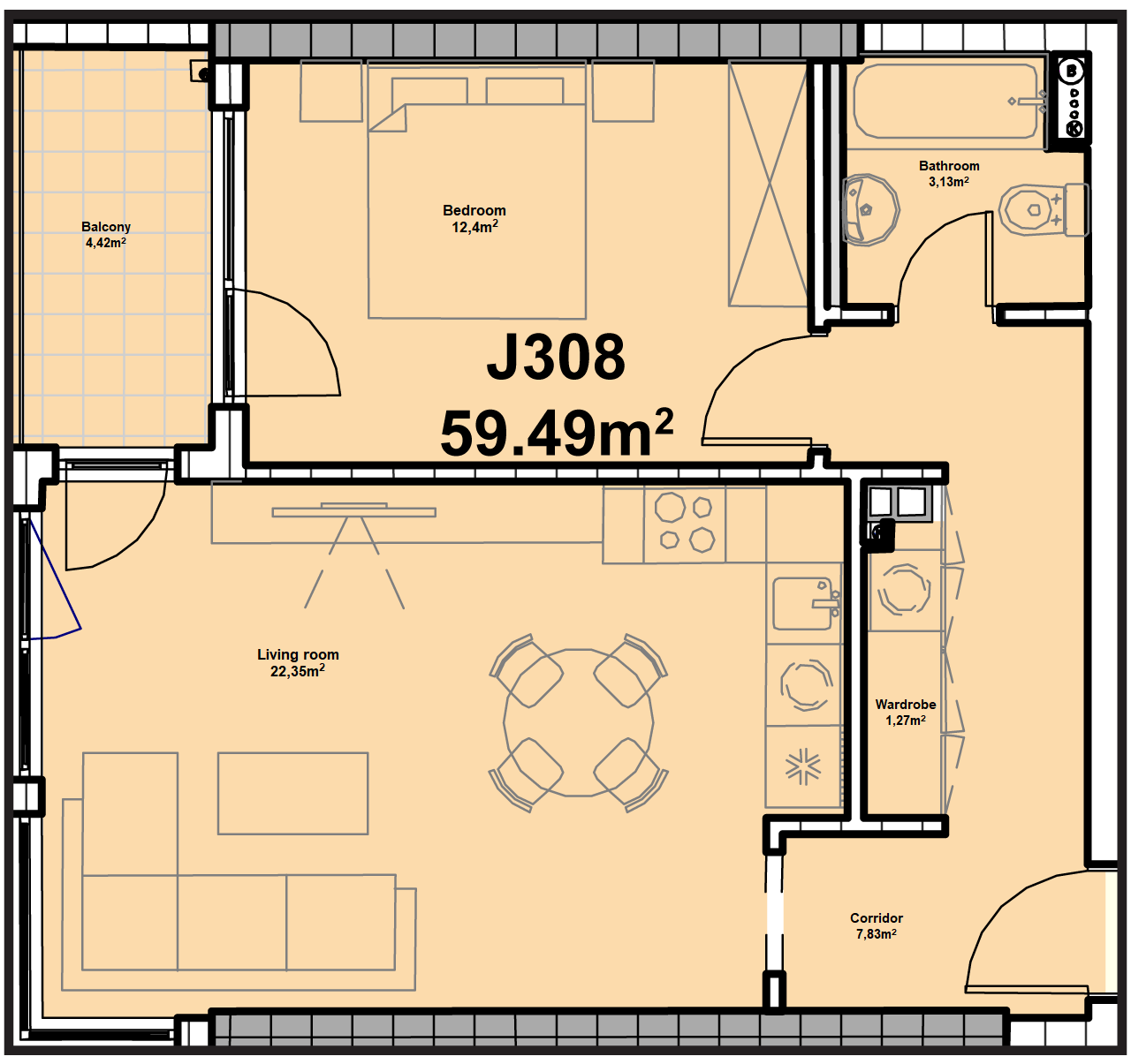 Floor 4 of Building J consists of 9 apartments with 1 or 2 bedrooms and terraces.