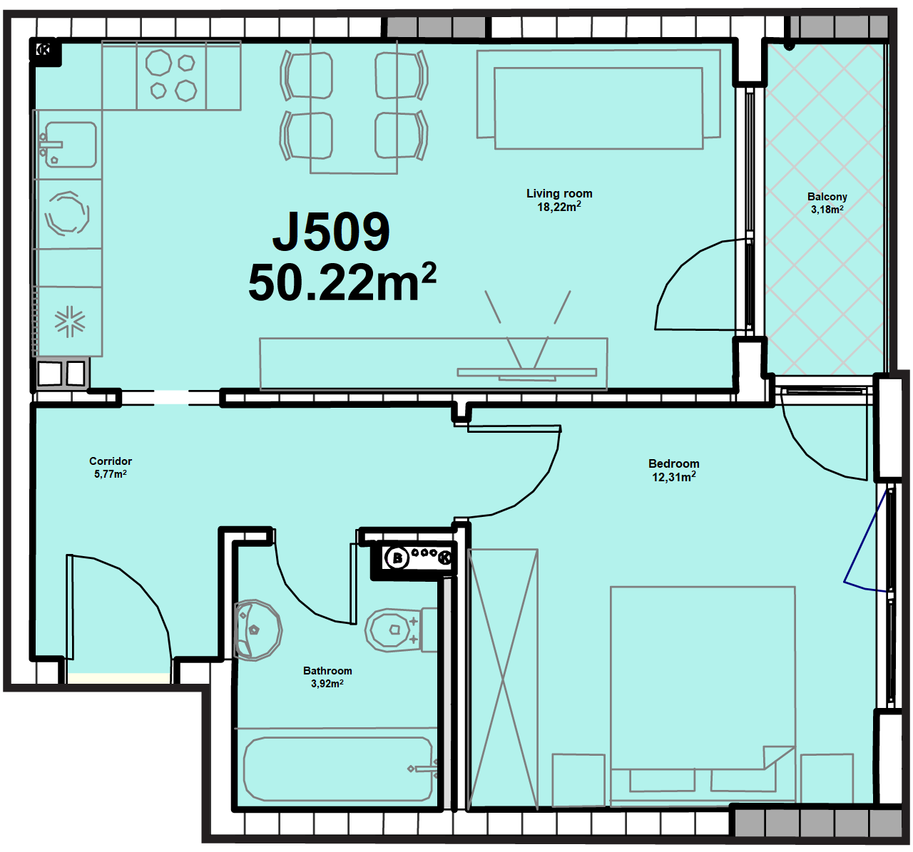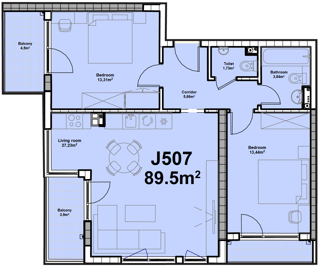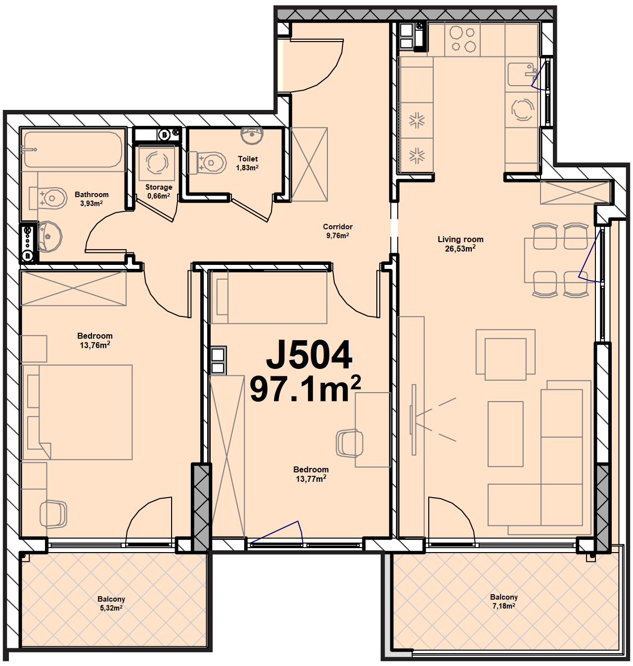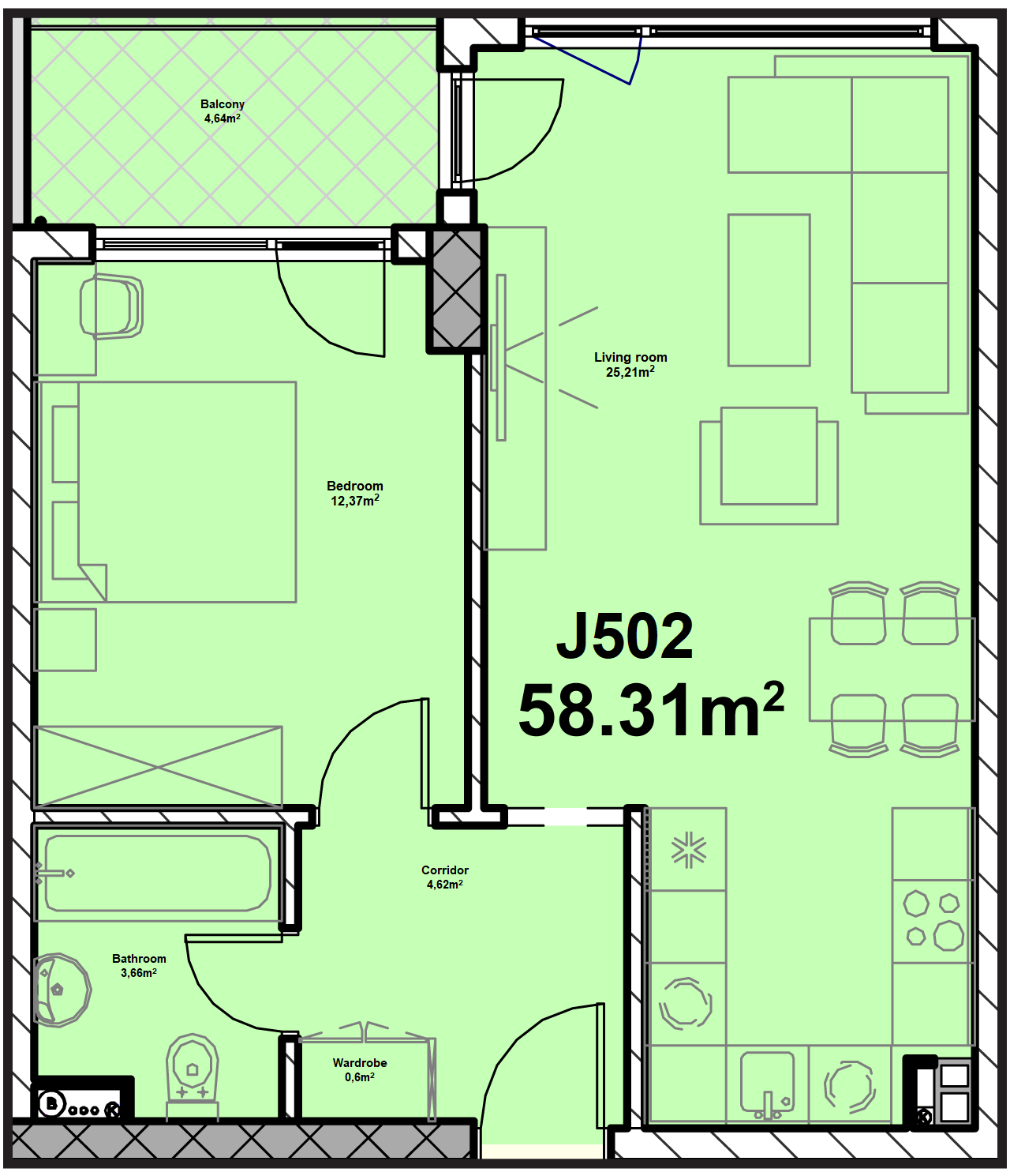 Floor 6 of Building J consists of 9 apartments with 1 or 2 bedrooms and terraces.